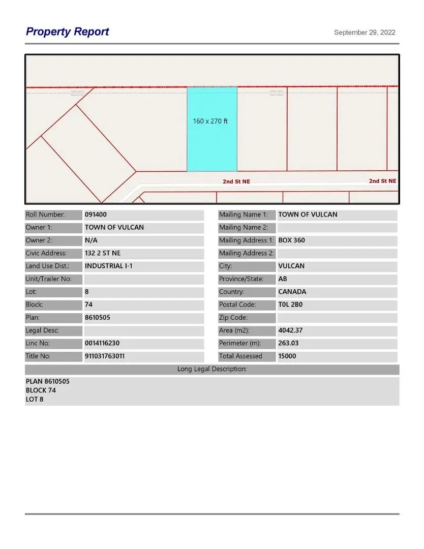 Industrial lot for sale in the Town of Vulcan Industrial Subdivision. Here is an opportunity to purchase one, or more, industrial lots at an affordable price, to set up your business. Term of sale - within 12 months from the closing date, a development agreement is to be completed, and construction on the property shall commence within 12 months of the date of the execution of the development agreement.