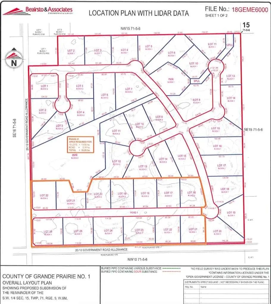 DEVELOPMENT PARCEL! Welcome to the new acreage community just SE of Grande Prairie - Heritage Estates! 146.91 acres East of Signature Falls, Sandy Ridge Estates, etc. along 68 Avenue and RR53. Wetland Assessment completed and subdivision plan approved by County. First phase approval has 13 lots ranging from 2.47 acres -3.12 acres each. The quarter to the East is also available for sale and would be ideal for future phases (MLS# A2123359).